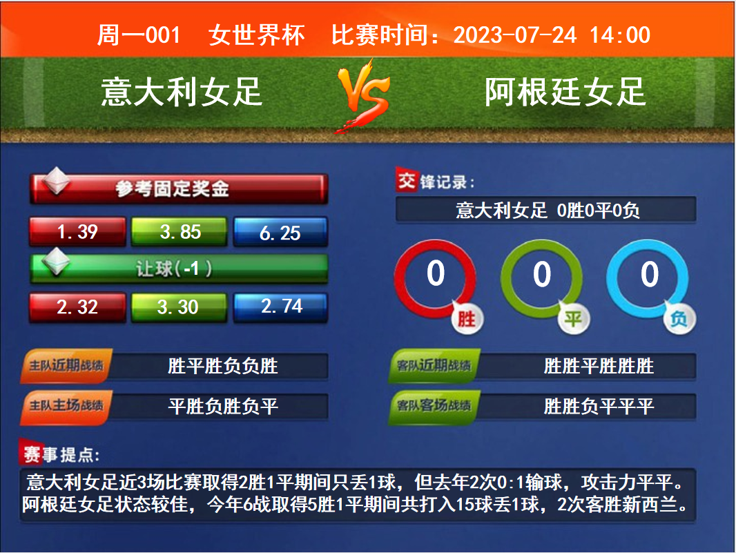 比賽時間:2023-07-24 14:00賽事提點:意大利女足近3場比賽取得2勝1平期間只丟1球,但去年2次0:1輸球,攻擊力平平。阿根廷女足狀態較佳,今年6戰取得5勝1平期間共打入15球丟1球,2次客勝新西蘭。