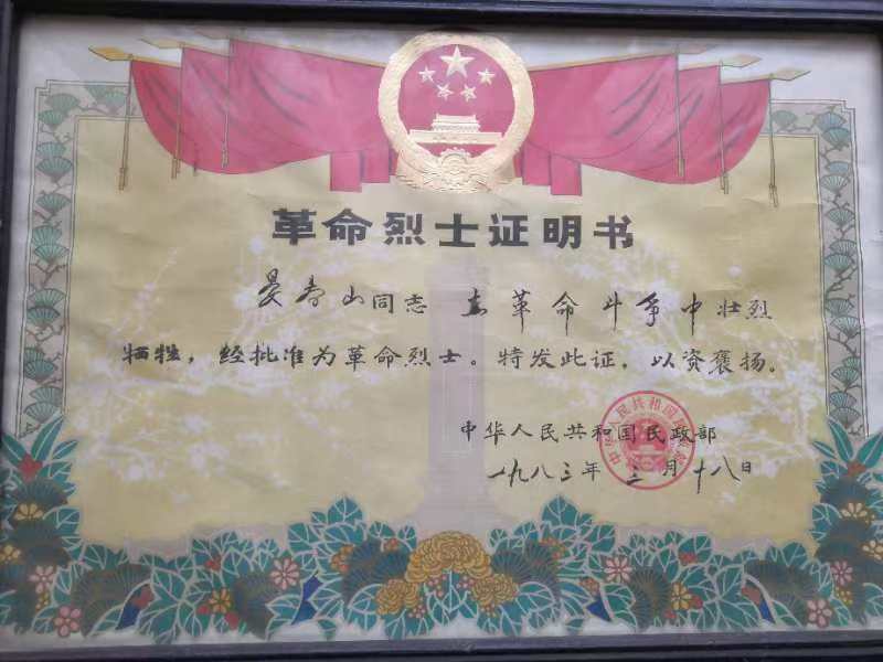 晏春山革命烈士證明書。
