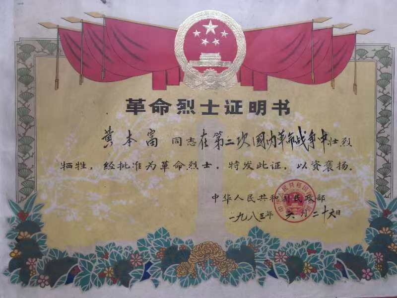 黃本富革命烈士證明書。