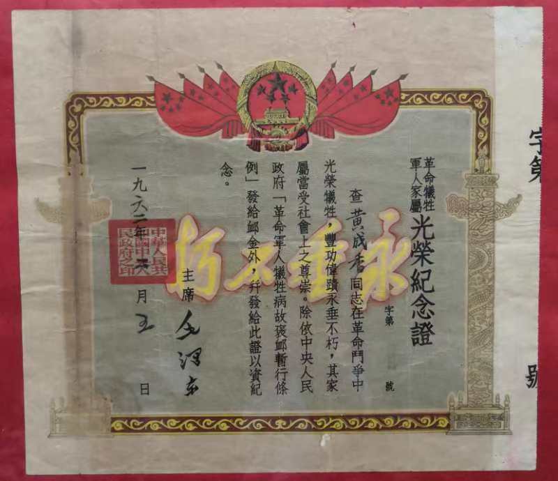 黃成香革命犧牲軍人家屬光榮紀念證。