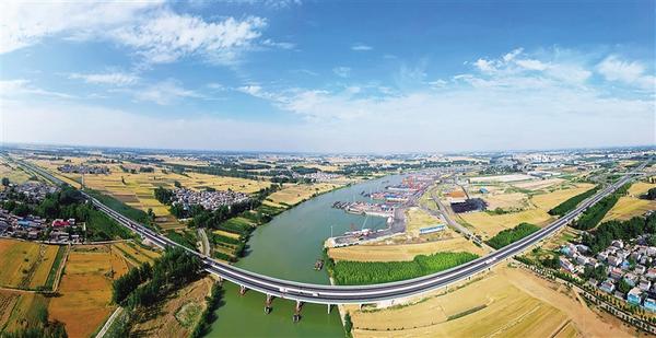 5月27日,周口港中心港區(qū)在碧水、藍(lán)天、白云、金色麥浪、秀美村莊的映襯下,顯得十分壯美。近年來,我市利用水陸交通優(yōu)勢(shì),加快構(gòu)建“鐵公機(jī)水”多式聯(lián)運(yùn)體系,努力從“經(jīng)濟(jì)通道”邁向“通道經(jīng)濟(jì)”。