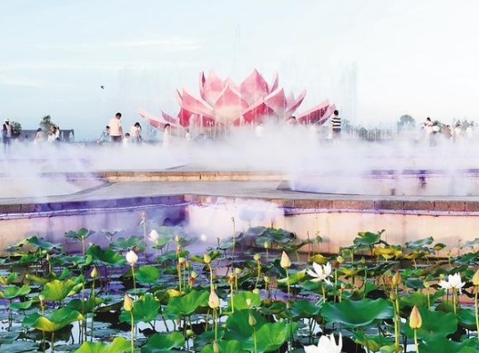 7月3日傍晚,淮陽龍湖荷花苑里,前來乘涼的市民絡(luò)繹不絕。在一朵粉紅色的荷花造型景觀周圍,噴泉映光影、水霧繞碧荷,如夢(mèng)如幻,宛如仙境。