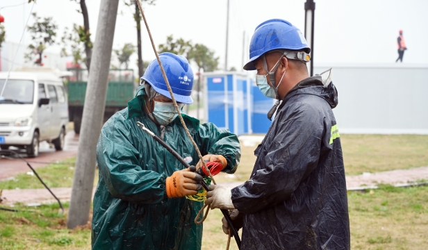 3月25日,在太康縣北環路核酸檢測方艙和隔離方艙建設現場,國網太康縣供電公司工作人員正冒雨施工為其提供電力保障。