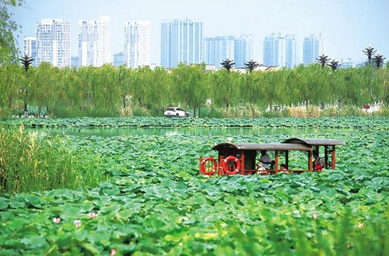 龍湖的夏天,是屬于荷花的季節。圖為8月3日,游客們泛舟湖上,穿梭于紅荷綠葦間,感受“神州第一荷”的風雅。