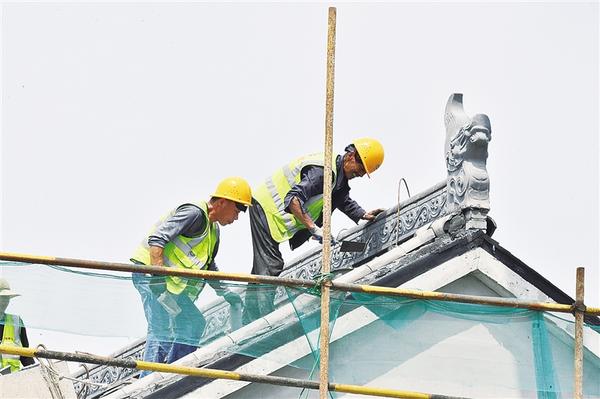 7月10日,在三川十館項目工地,工人冒著高溫為屋頂覆瓦。據了解,經過一年多緊鑼密鼓的建設,關帝廟歷史街區城市更新改造項目二期主體工程墻體填充完成,屋頂覆瓦過半。