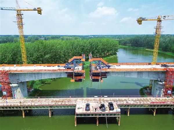 6月30日,中鐵七局的工人正在平漯周高鐵周口段跨潁河大橋上施工。平漯周高鐵周口段跨潁河大橋是中鐵七局在周口境內(nèi)施工的三條跨河橋梁之一,于2023年動(dòng)工,橋長(zhǎng)416米,預(yù)計(jì)本月底合龍。