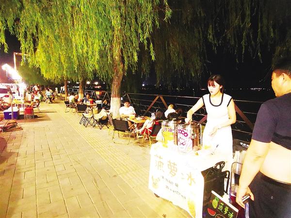 7月5日晚,市民在淮陽(yáng)龍湖湖畔一邊享受夏夜的涼風(fēng),一邊吃飯聊天。沿湖各種小吃應(yīng)有盡有,熱鬧非凡。