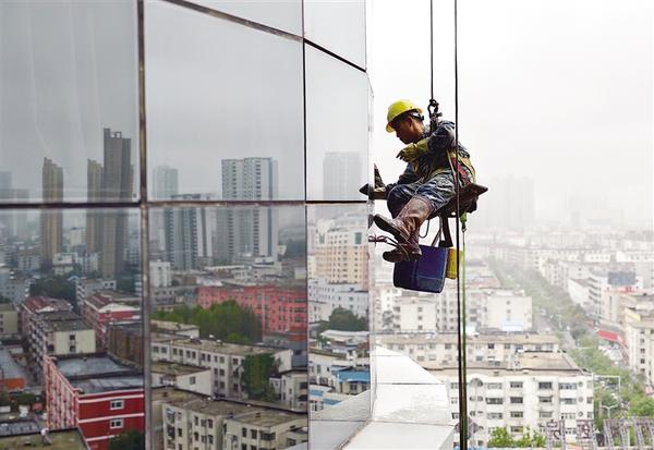 近日,一名“蜘蛛人”在中心城區一座大樓的外墻面認真作業,為城市的美麗和整潔貢獻著自己的力量