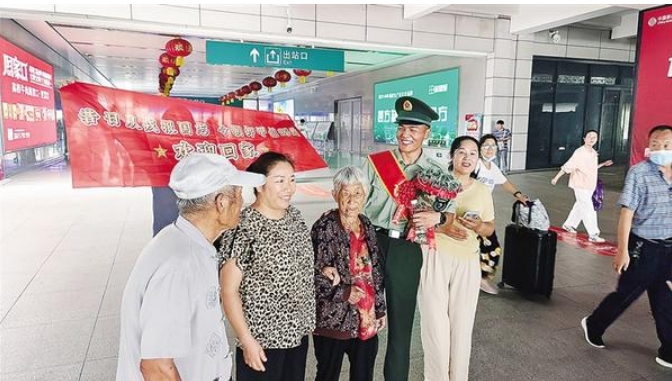 9月4日,在高鐵周口東站出站口,市民們早早守候,手拉橫幅,眼里閃著期待的淚光,迎接從部隊退役的親人。