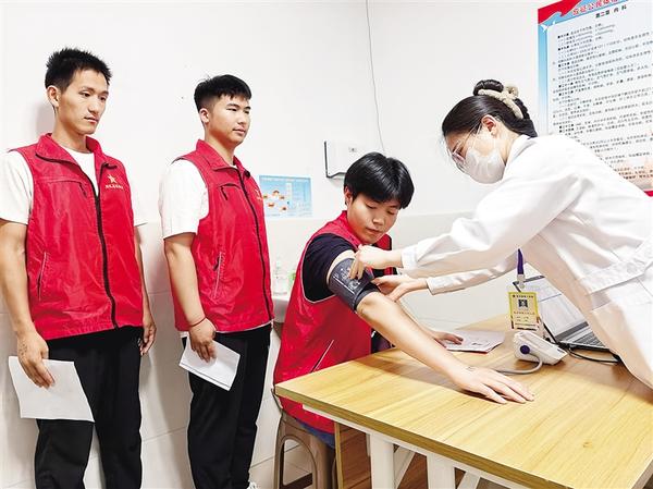 體檢現場,應征青年統一穿著紅馬甲,手持體檢指引單、廉潔征兵公開信,排著整齊的隊伍,逐個科室參加體檢。醫生現場檢查、現場告知結論、現場簽字確認、現場錄入體檢結果,在體檢結束后發放體檢結論告知書。