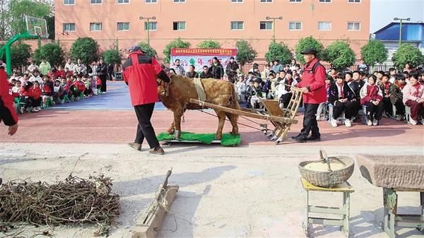 12月5日上午,在項城市人民路小學,項城市德高民俗博物館志愿者將傳統農具當作教具,向師生講解拖車、犁、耙、耬等農具的結構、起源、發展、應用等。