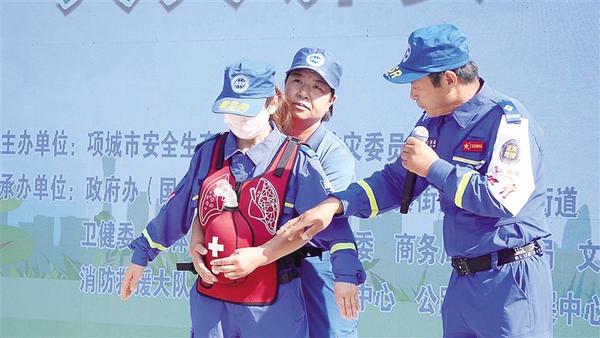 6月16日,項城市舉行“安全宣傳咨詢日”活動。活動設置警示教育片展播、應急技能演示、救援裝備展示、安全咨詢等環節。圖為項城應急藍天救援隊3名隊員演示海姆立克急救法操作流程。