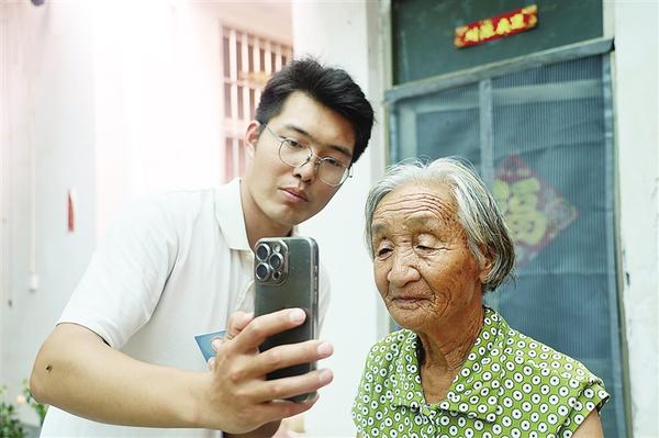 在淮陽區王店街道祝寨村,返鄉大學生周宏領為老人完善身份信息。近日,淮陽區開展80歲以上老人津貼系統信息更新工作,為確保政策精準落實,老人需提供最新身份信息。