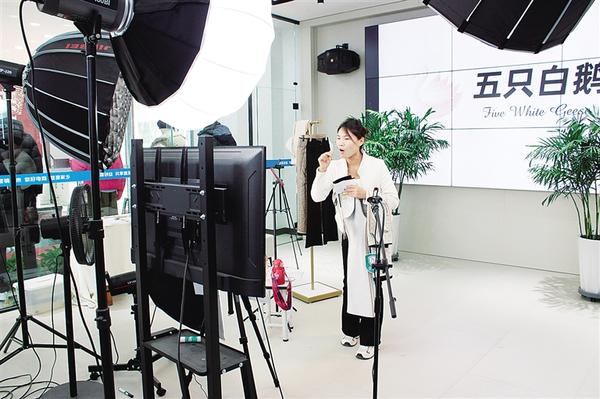 近日,在太康縣返鄉(xiāng)創(chuàng)業(yè)服飾產(chǎn)業(yè)園,一家服裝企業(yè)的工作人員通過(guò)網(wǎng)絡(luò)直播的形式售賣(mài)服裝。