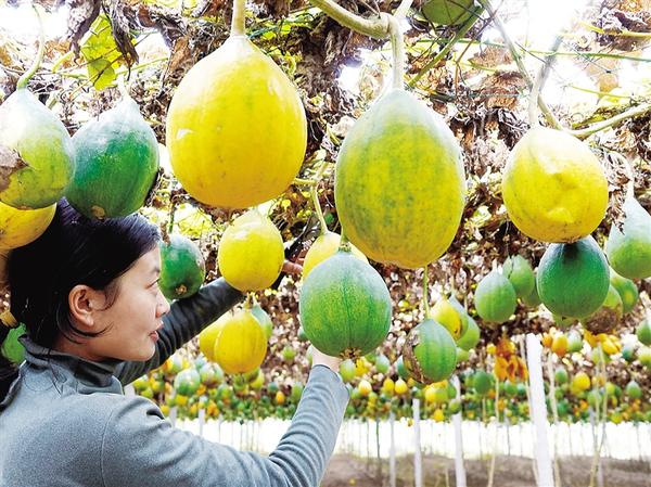 11月11日,記者在周營鎮謝營行政村一處生態瓜蔞產業基地看到,瓜蔞支架上藤蔓纏繞,一個個沉甸甸、金黃色的瓜蔞如同一盞盞燈籠懸掛在空中。村民正忙著采摘瓜蔞,整個基地呈現一派喜人的豐收景象。