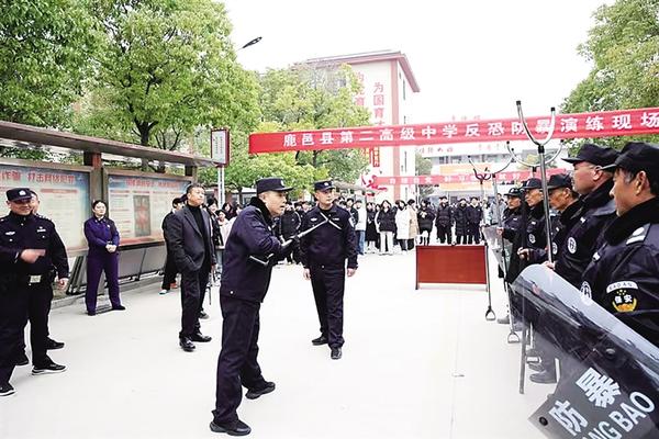 為進一步加強校園安全管理,確保廣大師生生命安全,12月4日,在鹿邑縣公安局衛(wèi)真派出所民警的指導下,縣第二高級中學組織安保人員開展反恐防暴演練。
